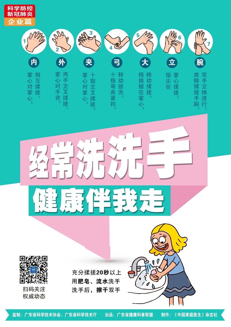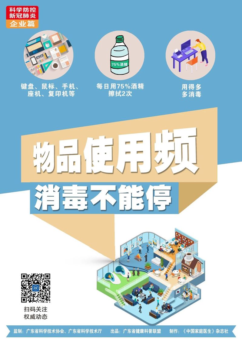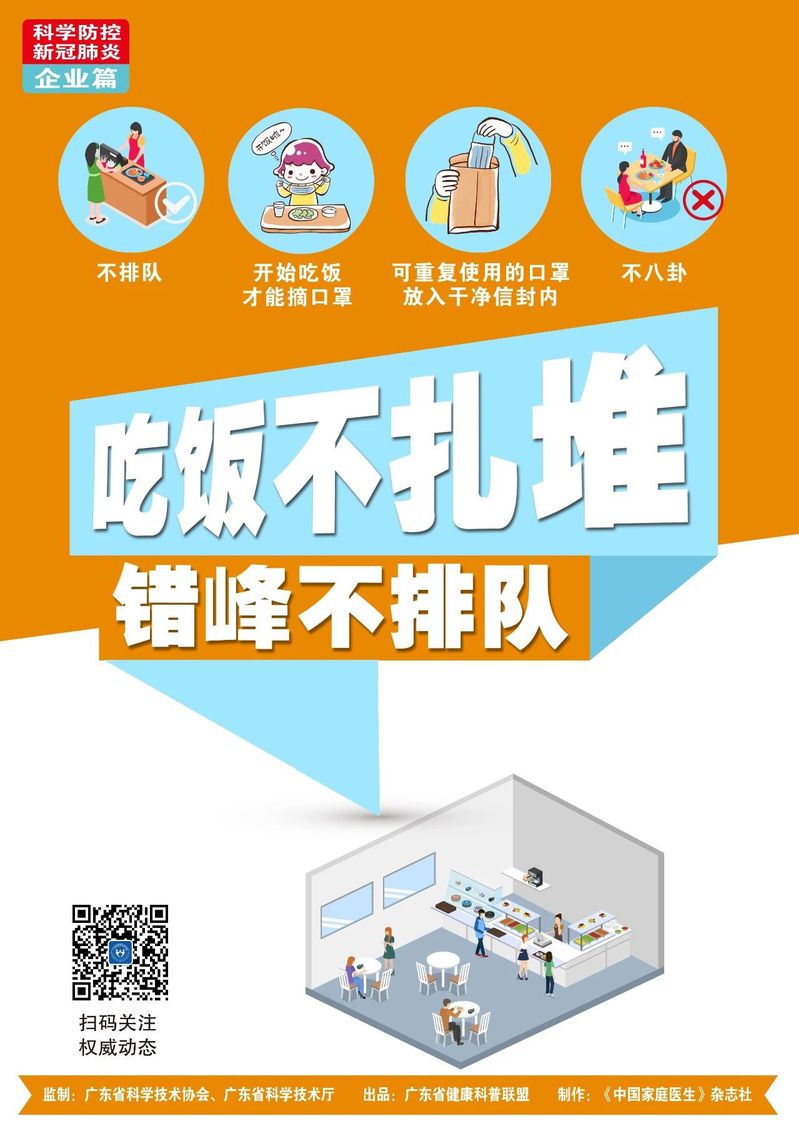 2月10日起,大量企业即将复工,如何做好疫情防控,成为很多人关心的重点。由广东省科学技术协会、广东省科学技术厅监制,广东省健康科普联盟出品,联盟成员单位《中国家庭医生》杂志社制作的科学防疫应急科普宣传画——企业篇,教给你企业疫情防控的“八招”法宝,让你工作防控“两不误”。为方便大家下载打印使用,我们将“科学防控新冠肺炎系列挂图”上传至百度云盘免费共享,内含(长)图片、源文件等,大家可点击页面底部的阅读原文,立即下载。