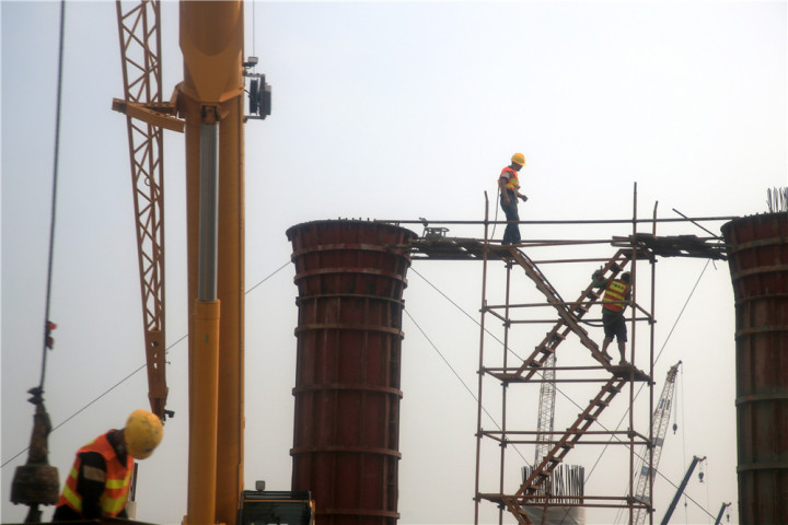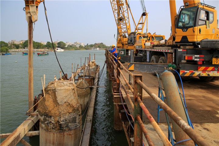 其中,项目澄海段全长约1.5公里的莲阳河特大桥地处韩江三洲冲积平原,地质条件复杂,水中钢栈桥、钢平台、水中超长桩的质量控制,主桥连续梁悬挂篮施工的安全、质量管控及风险预防都是施工难点。针对这些困难,施工单位在拟建桥梁上游搭设了临时钢栈桥,中间预留通航孔,根据桥墩位置搭设支栈桥和钢平台作为水上施工平台,为大桥水中超长桩施工提供了安全保障和作业空间;同时采用气举反循环和泵吸反循环钻机等先进设备,以提高桩基础作业效率。