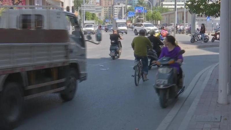 昨天上午10点多,记者在黄河庐山路口看到,这里的交通秩序较为混乱。不少摩托车、电动车、共享单车逆行进入庐山路。你看,这部无牌摩托车居然搭载了4人,而且都没戴安全头盔。
