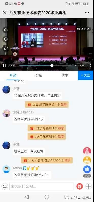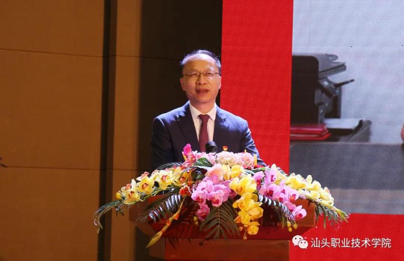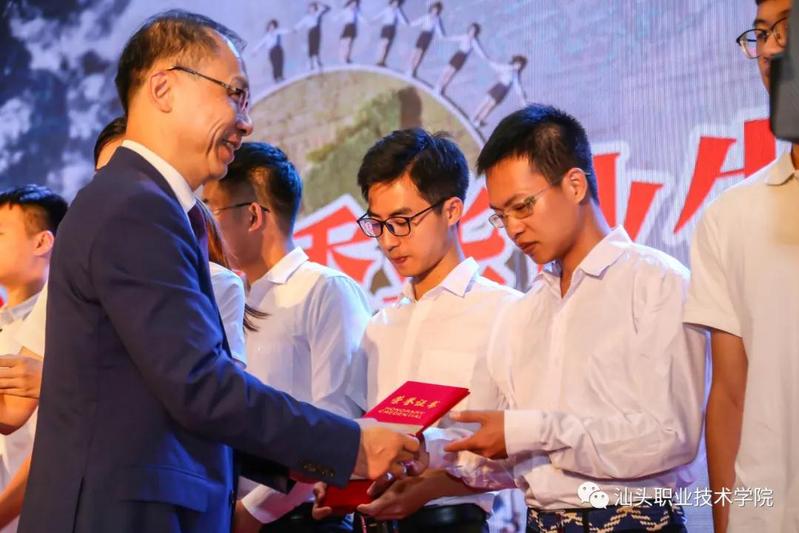 毕业典礼在雄伟的国歌声中拉开帷幕。学院党委书记王小辉首先致辞。王小辉书记对2020届毕业生及其家长表示最热烈的祝贺,对同学们努力学习、成绩优异、遵守纪律、服务社会,为学院争光添彩表示衷心感谢。王书记对在这次疫情防控阻击战中不畏艰险、冲锋在前的学院学生表示充分的肯定和高度的赞扬,汕职院的学生用行动证明了他们是好样的,是堪当大任的!王小辉书记总结了16万汕职院优秀校友的奋斗经历,对2020届毕业生提出了顺应潮流、艰苦奋斗、终身学习三个方面要求,希望同学们要把个人理想与国家的前途和命运结合起来,百折不挠、引领学习,祝福同学们书写无愧于时代、无愧于历史的华彩篇章!