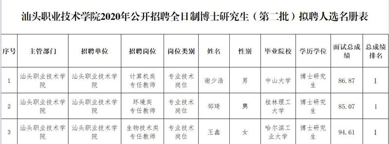 根据《汕头市市属事业单位2020年公开招聘全日制博士研究生公告》、《汕头市市属事业单位2020年公开招聘全日制博士研究生补充公告(第二批)》等,因受新冠肺炎疫情影响,现先将必赢线路检测中心公开招聘全日制博士研究生面试合格并入围体检人选作为(第二批)拟聘人选进行公示。公示结果不影响聘用,并按规定体检、考察合格者,予以办理聘用手续。公示期间,如对拟聘人选有异议,可通过来信、来电、来访等形式向我们反映。
