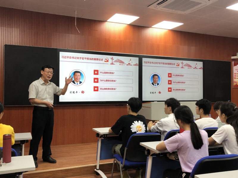 9月24日下午,学院党委委员、副院长、人文社科系党总支书记陈庭照在金园校区录播室以《树立远大理想,敢于担当作为》为题,为人文社科系近100名学生开讲2020年秋季学期“思政第一课”。