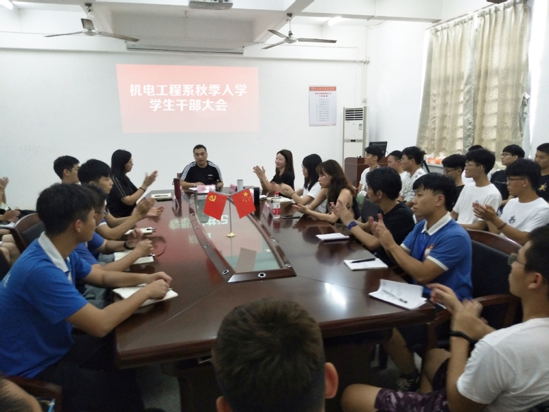 2020年9月7日下午,机电工程系召开了新学期学生干部大会,对新学期机电系学生干部的相关工作进行了动员和部署。会议由学生科辅导员章秀纯主持。机电工程系党总支副书记郑瑕、学生科科长陈玮苹和全体辅导员出席了会议。