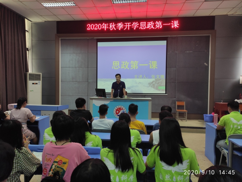 2020年9月10日下午2:30,自然科学系主任张文腾在阶梯教室讲授了2020年秋季开学思政第一课,自然科学系学生科长、辅导员及全体学生干部到场听课。