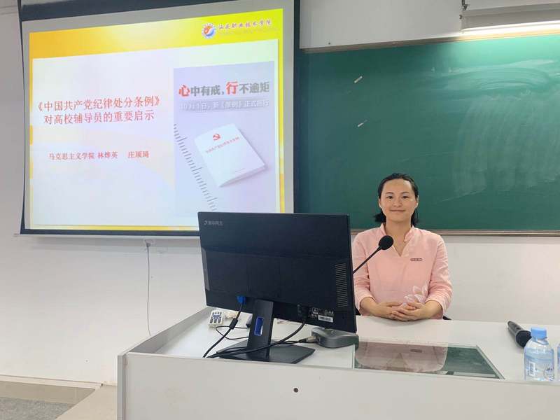 专题讲座上,林烨英老师从三个方面展开讲解:一是对新的《中国共产党纪律处分条例》的修订历史、修订意义和修订的主要看点进行了分析;二是以案说纪,从近几年在高校党员干部和教师队伍中发生的违反六大纪律的典型案例入手,分析这些违纪违法行为产生的原因和不良影响;三是结合《中国共产党纪律处分条例》对高校辅导员的重要启示,特别强调辅导员在生活纪律方面的要求,要求大家注意自己的言行举止,表里如一,为人师表,不断提升自身修养和职业道德,真正做到习近平总书记所要求的“要给学生心灵埋下真善美的种子,引导学生扣好人生第一粒扣子。”