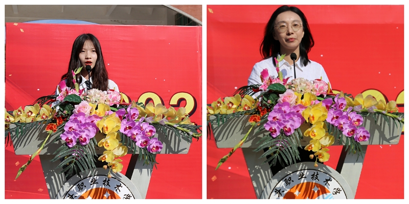 新生代表钟晓爱同学、教师代表周晓红老师做了发言。