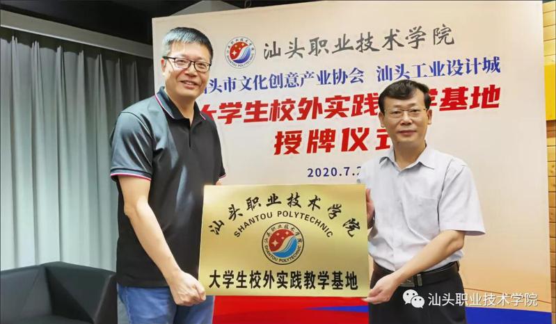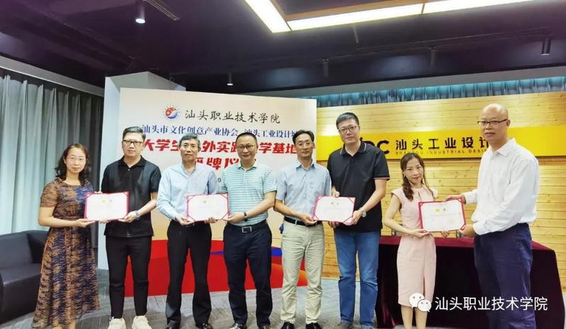 为深入贯彻落实习近平总书记关于职业教育要坚持产教融合、校企合作,坚持工学结合、知行合一,引导社会各界特别是行业企业积极支持职业教育,努力建设中国特色职业教育体系的有关精神,7月23日上午,学院大学生校外实践教学基地(文化创意与策划)授牌仪式在汕头工业设计城二楼国际会议厅举行。此次仪式由学系党总支副书记黄小铭主持,学院副院长陈庭照、教务处副处长黄健新、技能实训中心副主任陈榕、学系副主任杨映红、语言文化传媒教研室主任李沫彦等参加了校外实践基地授牌仪式。汕头市文化创意产业协会(下面简称:文创协会)会长陈维、执行会长侯陆勋、秘书长陈佳妮、各专委会主任吴轩嘉、陈旭南、李辰宇;汕头工业设计城总经理陈加拿、运营总监卢欢妮等出席了仪式。