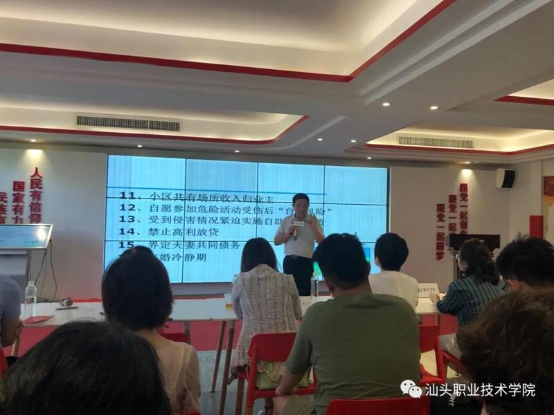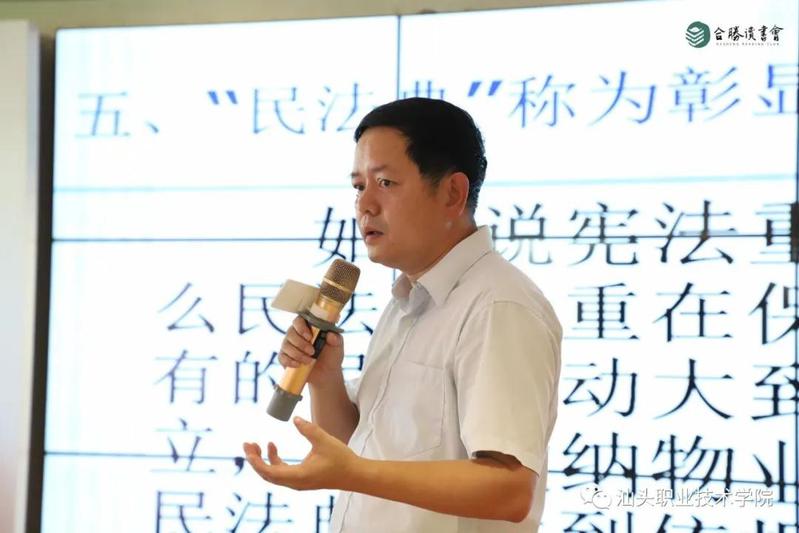 《中华人民共和国民法典》,是我国首部以法典命名的法律,它开了我国法典编纂立法的先河,具有里程碑意义。为深入学习领会《民法典》的精神实质,进一步增强学法、用法意识,7月20日,人文社科系第一党支部在支部书记林嘉同志的带领下,来到合胜党员会客厅,认真聆听了由汕头社科联和合胜读书会联合举办,由汕头大学马克思主义学院基础教研室主任、硕士生导师沈忆勇副教授主讲的“《民法典》彰显‘人民至上’的人文关怀”专题党课。