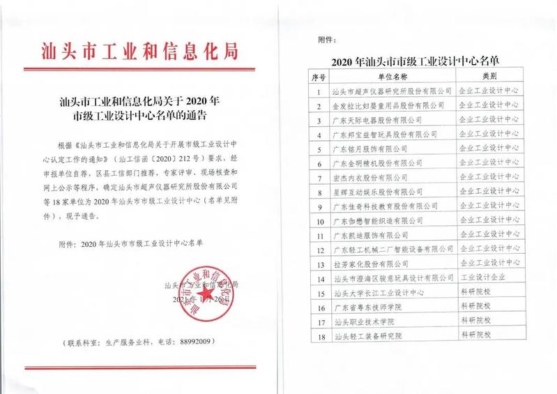 日前,根据《汕头市工业和信息化局关于2020年市级工业设计中心名单的通告》,我院顺利通过2020年汕头市市级工业设计中心的认定,我院又新添一个市级科研及创新服务平台。