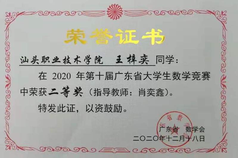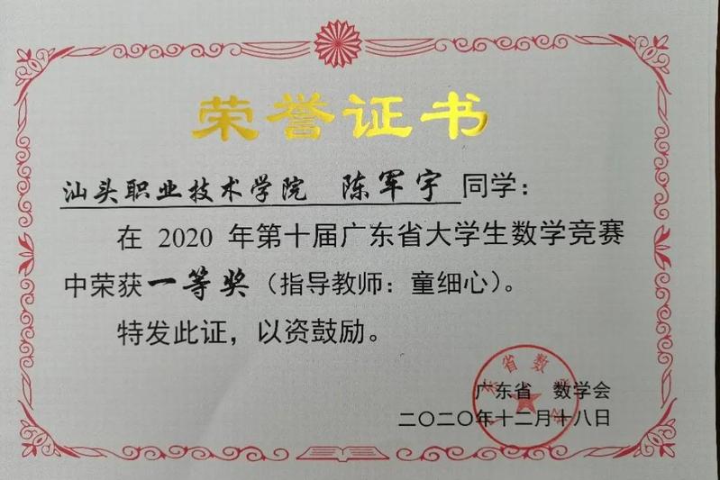 自然科学系牵头组队的学生团队在2020年11月28日举办的第十二届全国大学生数学竞赛初赛暨第十届广东省大学生数学竞赛中喜获“民办及高职高专类”佳绩,取得了8人参赛5人获奖的佳绩。其中一等奖2人,分别为2019级数学教育3班的陈军宇同学和2019数学教育1班的蓝家荣同学;二等奖2人,分别为2018数学教育1班的王梓奕同学和2018数学教育2班的吴海峰同学;2018机电一体化2班的文浩炼同学获三等奖。