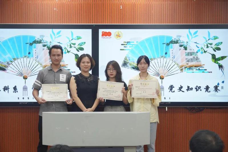 场内学习氛围浓厚,同场竞技激烈,参赛选手在赶超比拼中激烈角逐,以丰富的党史知识储备和精彩的临场发挥,赢得了现场观众的阵阵掌声。经过两个小时的激烈比拼,最终第五组荣获一等奖,第三组、第一组分别获得二等奖和三等奖。比赛结束后,由人文社科系办公室主任郑菲、第一党支部书记林嘉、团总支书记刘乔、辅导员王棋分别为获奖队伍颁发证书。
