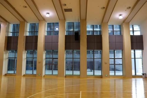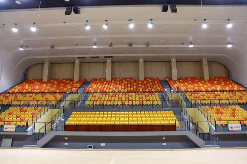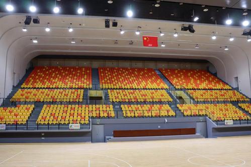 光滑的地面配上明亮的灯光,室外的光与室内的光逐渐融为一体,照亮整间篮球场,刘少斌老师介绍到亚青会室内篮球场更适合运动员进行比赛。