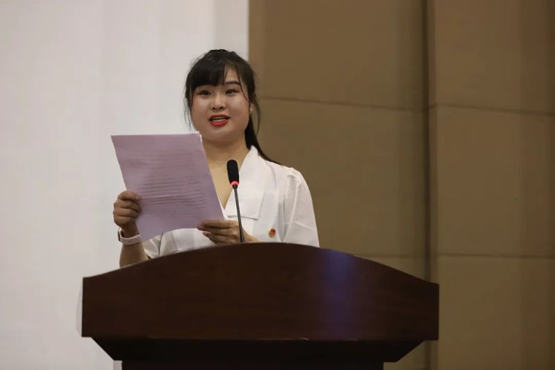 会上,现场团员共同重温入团誓词。面对着鲜艳的团旗,他们举起右拳,庄严宣誓。会场回荡着响亮的入团誓词。团员们在铿锵有力的重温誓词中,仿佛又回到了当初入团时激动人心的时刻。