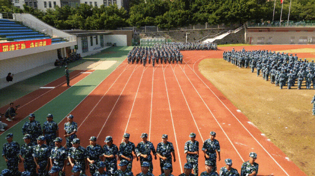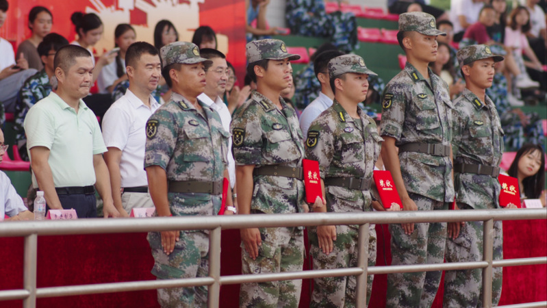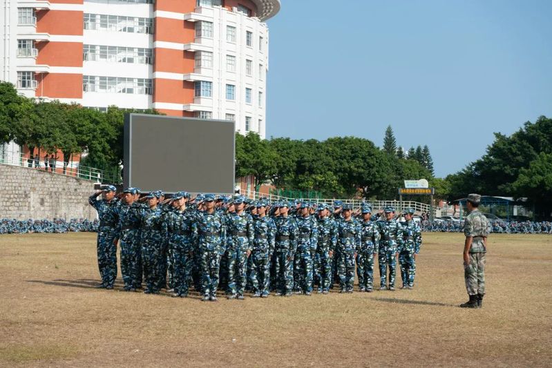总结大会在全体起立,奏唱国歌中拉开了帷幕,随后全体人员共同观看了2023级全体新生军训回顾视频,回首了14天同学们青春激昂的军训生活。