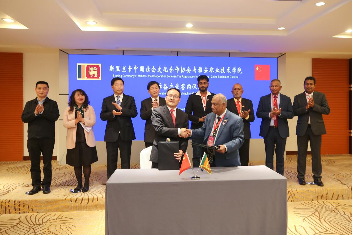 During the event, Fan Xianmao, member of the party committee and vice president of our school, signed a memorandum of cooperation with Indranande Abesekela, president of the Sri Lanka-China Association for Social and Cultural Cooperation to carry out teacher-student exchanges, international student exchanges, and exchange of educational resources. Hongliu, President of Sichuan People's Association for Friendship with Foreign Countries, Song Kaihui, Member of the Standing Committee of Ya'an Municipal Committee and Executive Deputy Mayor, Li Chunmo, Secretary of the Party Committee of Ya’an Polytechnic College, and Shi Jing, President of the Ya’an Polytechnic College attended the meeting and witnessed it together.