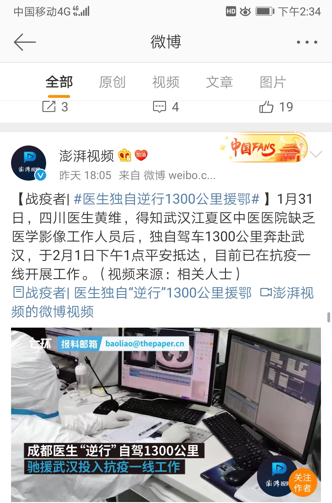 四川省乐山市沙湾区人民医院放射科医生黄维,从微信群中得知武汉市江夏区中医院缺乏医学影像人员,经报送个人材料至武汉,该院审核通过,征得家人和单位同意后,于1月31日独自驾车1300公里前往武汉,2月1日顺利抵达后...