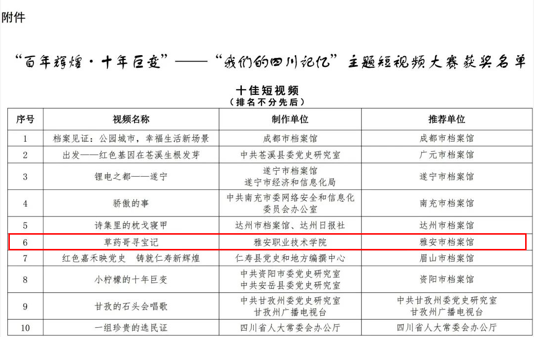 近日,由四川省档案馆、中共四川省委党史研究室、中共四川省委网络安全和信息化委员会办公室联合举办“百年辉煌·十年巨变”——“我们的四川记忆”主题短视频大赛获奖名单公示。学院拍摄的短视频《草药哥寻宝记》获评“十佳短视频”。《草药哥寻宝记》讲述了学院药学与检验学院教师刘德军,深耕中药材种植产业,激发了一批学生对生产雅药,发展雅药的热情。其中,毕业生张健主动投身家乡的产业振兴,发挥自身所学专业技能,在家...