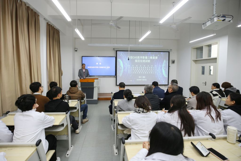 为推动医学影像技术专业数字化转型,提升人才培养岗位适应性,11月26日上午,学校在人工智能医学影像三维重建生产性实训基地启动第一期海信CAS医学影像三维重建规范化培训工作。学校党委副书记、校长黄诚,党委常委、副校长樊先茂,副校长彭裕红及青岛海信医疗设备股份有限公司研发负责人李和意、西南区负责人周强,四川四凯发展科技集团有限公司副总经理文德永出席开班仪式,我校相关专业50余名师生成为首批受训学员。开班仪式...