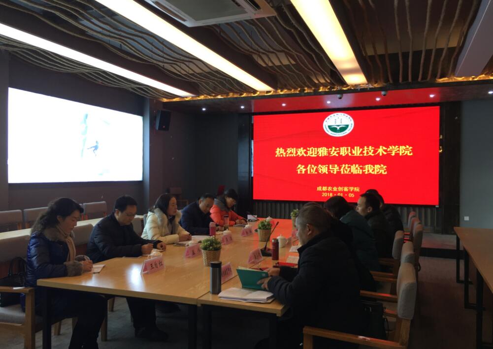 【本网讯】1月5日,学院招生就业处副处长吴洁带队,成人教育培训处长勒伟、团委书记刘永恩、教务处副处长孟伟等一行七人前往成都农业科技职业学院交流学习。 我院一行受到了农科院创客学院执行院长何利平的热情接待,...