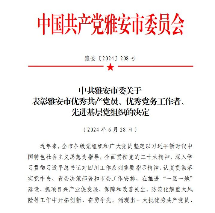 在庆祝中国共产党成立 103 周年之际,中共雅安市委对全市 55 名优秀共产党员、30 名优秀党务工作者、55 个先进基层党组织予以表彰。我校马克思主义学院直属党支部被评为先进基层党组织,余强、刘永恩两名同志分别被授予优秀共产党员、优秀党务工作者的光荣称号。希望全校各二级党组织和广大党员要以受表彰的先进集体和优秀个人为榜样,不断加强组织建设,切实发挥战斗堡垒作用,教育引导党员坚定理想信念、锤炼对党绝对忠诚的政...
