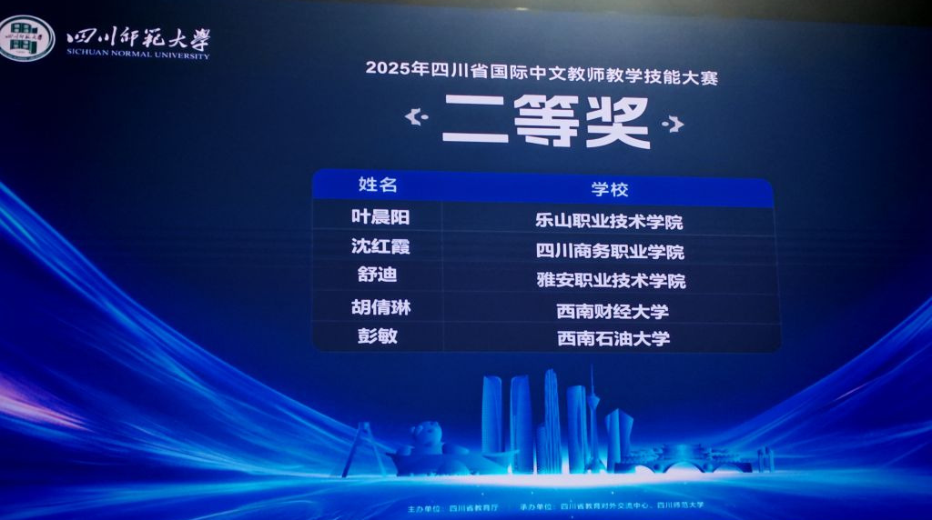 近日,四川省国际中文教师教学技能大赛圆满落幕,学校师范学院教师舒迪凭借扎实的专业功底、出色的教学能力和稳定的现场发挥,荣获省级二等奖。本次大赛由四川省教育厅主办,四川省教育对外交流中心与四川师范大学共同承办,旨在提升全省国际中文教师的专业技能与教学水平,促进国际中文教育事业的高质量发展。赛事自今年4月启动以来,吸引了全省50余所本科和高职院校的111名优秀教师同台竞技,竞争激烈。比赛分为初赛、复赛和...