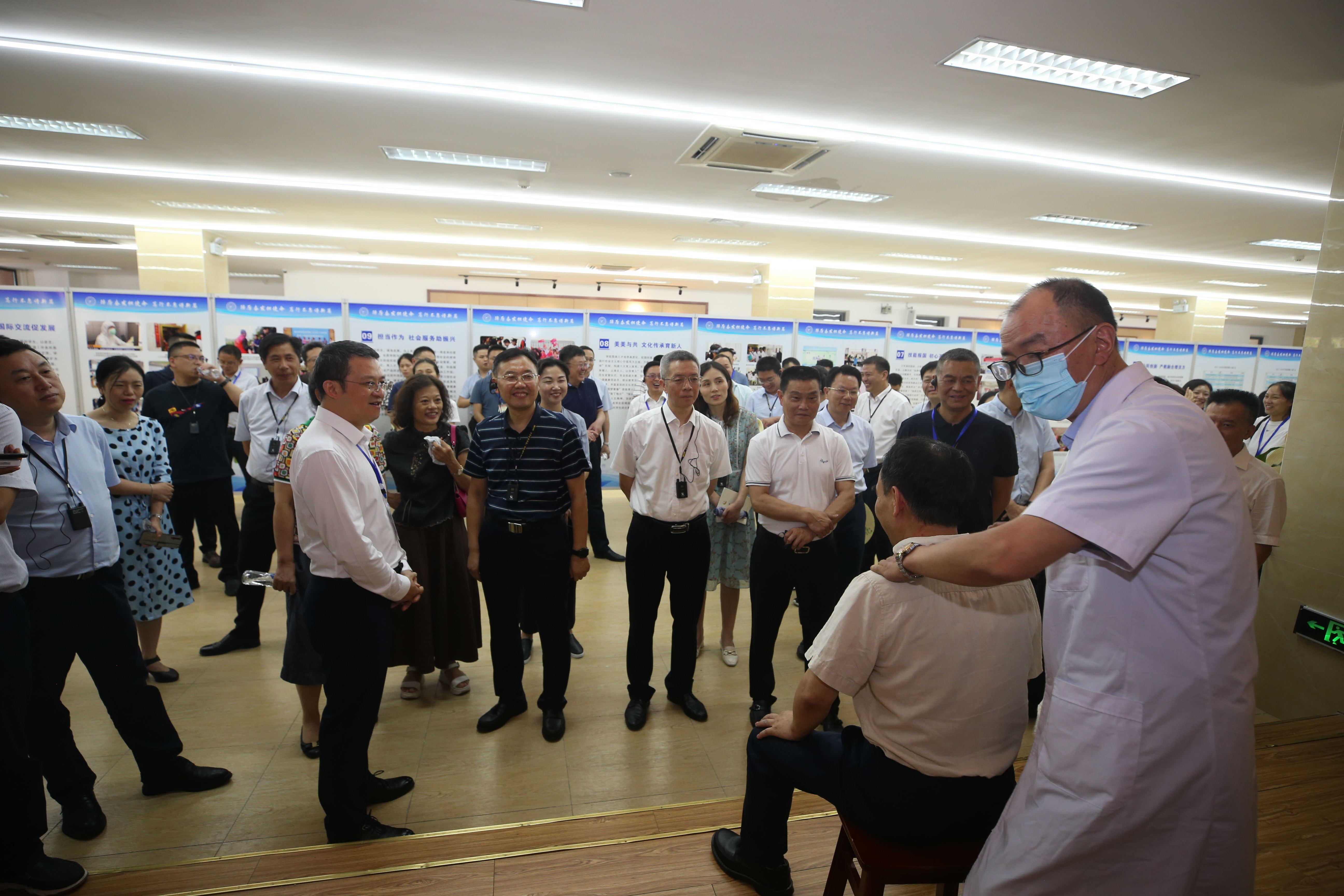 考察组一行观摩了护理学院、临床医学院、中医与康复养生学院学生展示的心肺复苏、外伤包扎、中医传统康复技术和现代康复治疗技术现场操作,我校在2021年全国乡村振兴职业技能大赛中荣获“养老护理员”项目职工组优胜奖的项目也进行了展示。领导嘉宾还饶有兴趣地亲身体验了腰椎、颈椎正脊手法和传统推拿手法、揿针技术等诊疗。大家了解了我校作为四川省科普基地的生命科学馆和中药标本馆基本情况。现场洋溢着浓浓的交流互动氛围,对我校弘扬中医药文化,培养中医药卫生健康人才取得的成效表示赞赏。
