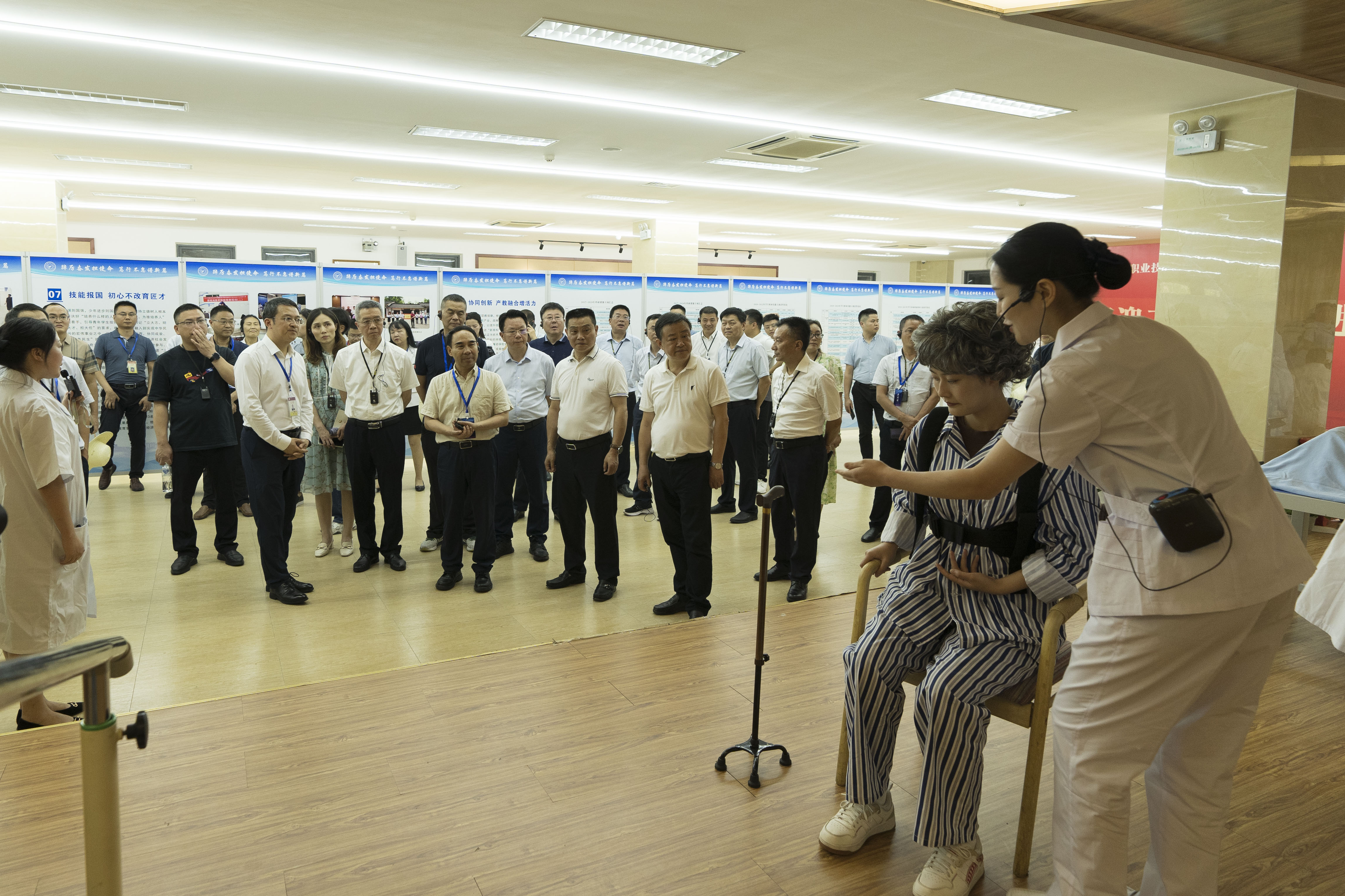 在办学成果展展厅,黄诚为考察组介绍了我校抓住两次灾后重建和国家高职教育三轮发展机会,不断改善办学条件,先后获批省示范性高职院校、省优质高职院校和如今的省“双高”计划建设单位,以临床医学专业群、药学专业群建设为重点,加强与本科院校联合培养护理学、医学影像技术专业本科层次技术技能型人才,推进学校高质量发展的情况;介绍了我校在创新实践“三阶递进、三课共育、五融五促”的“专业实训+劳动教育”人才培养模式、农村助理全科医师培养雅安模式,以及“专业集群+产业学院、产业研究院、乡村振兴学院、社区学院”的“一核四驱”专业发展与社会服务体系。