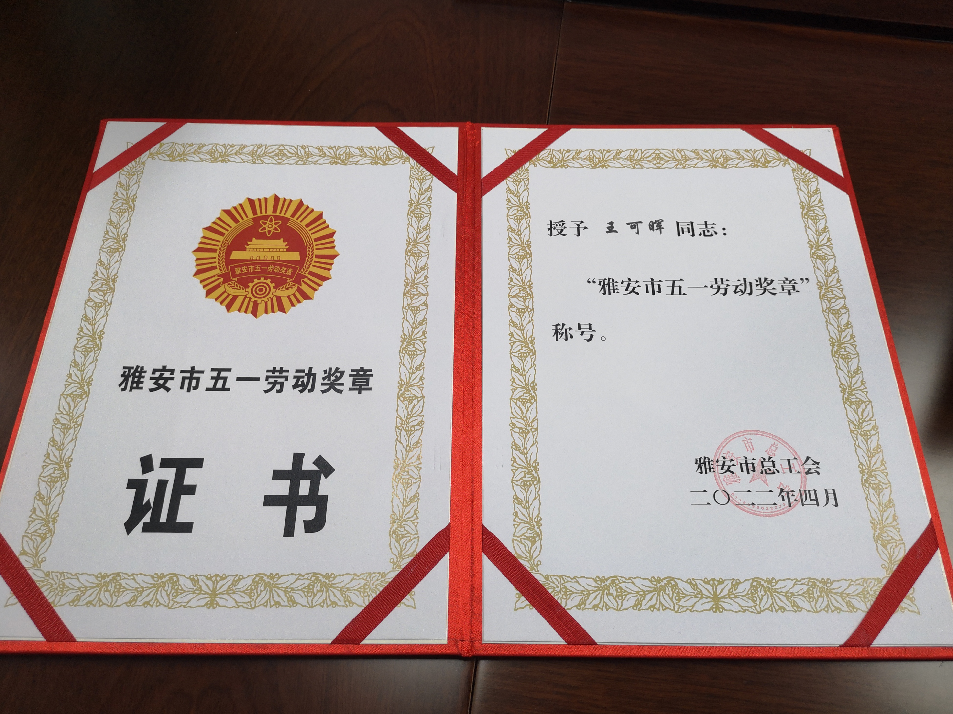 近日,我院王可晖同志荣获了雅安市总工会颁发的2022年“雅安市五一劳动奖章”。