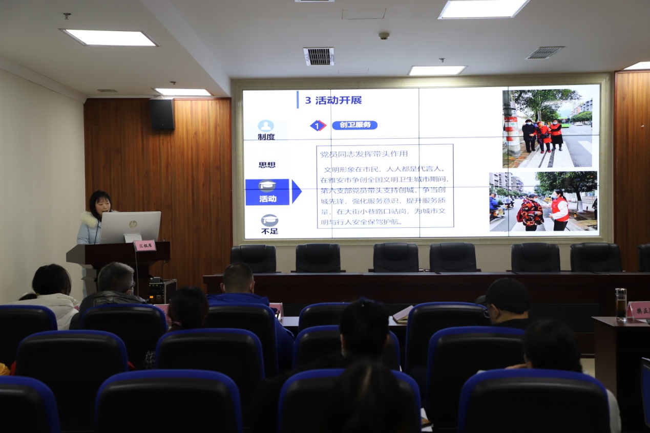 第一党支部至第九党支部书记分别从抓思想政治工作情况、履行抓党建主业主责情况、落实基层党建工作重点任务情况、完成重大任务情况、存在的突出问题、加强和改进工作的思路措施等方面依次进行了汇报。汇报结束后,参会人员采取无记名投票的方式对九个党支部书记抓党建工作开展现场测评。