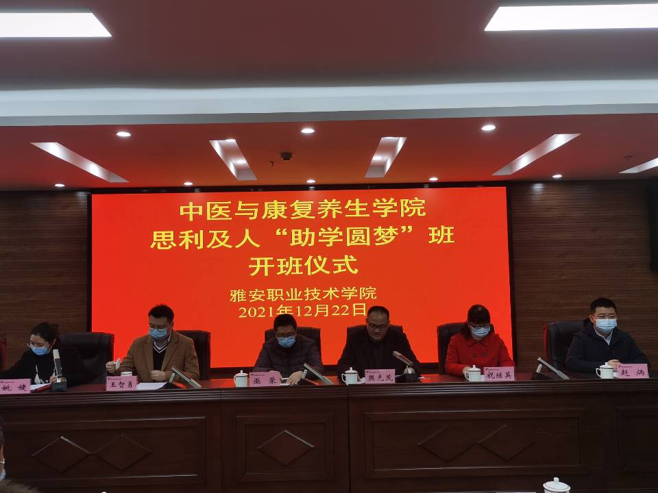 12月22日,思利及人公益基金会捐资设立的思利及人“助学圆梦班”开班仪式在学院举行。四川省委统战部港澳台处二级调研员巫蒙,学院党委委员、副院长樊先茂,思利及人公益基金会王智勇、赵炳,中医与康复养生学院直属党支部书记祝继英、副书记沈军等出席了开班仪式。仪式由学生工作部(处)姚婕主持。