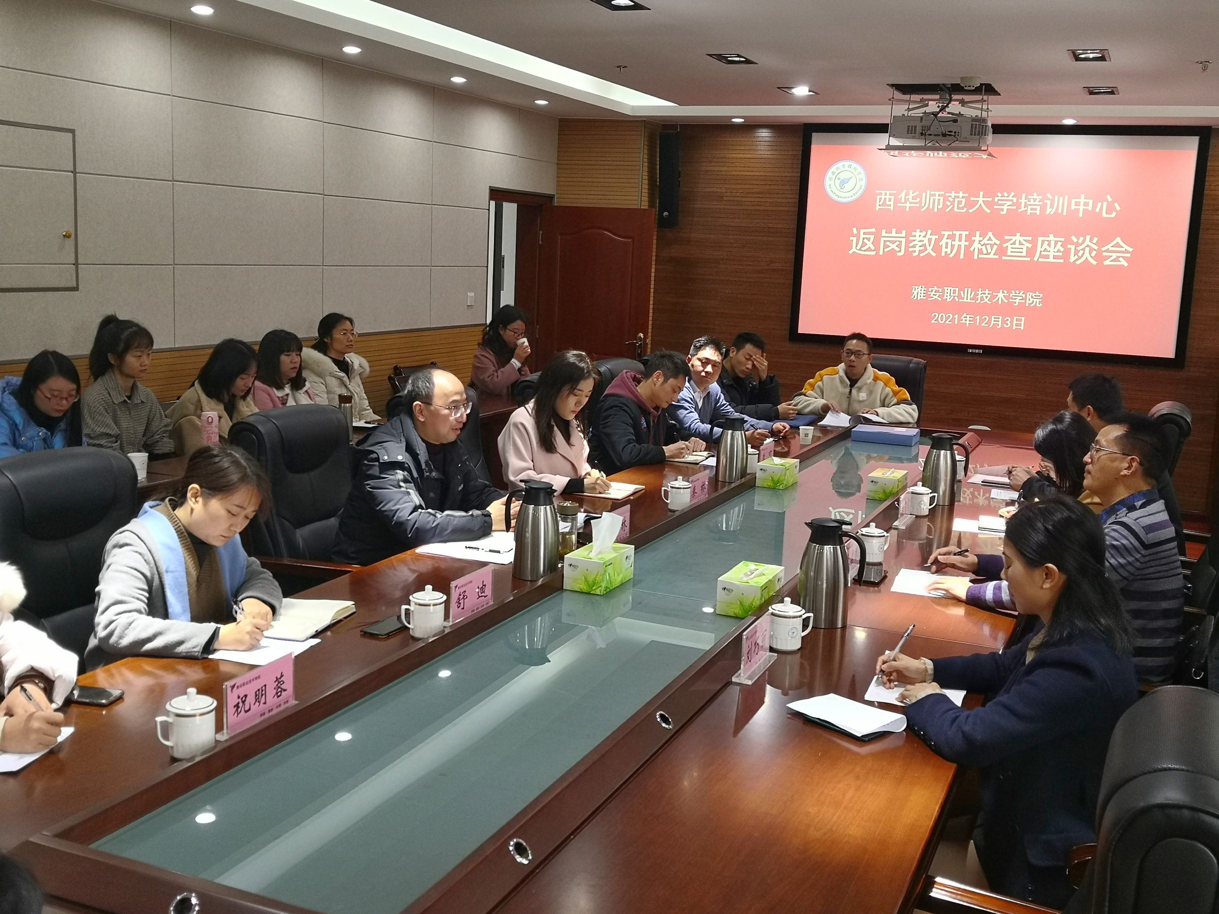 12月3日上午,西华师范大学教务处副处长张启春、雅安市教育局基础教育科副科长吴霄霄等一行4人来校,对学院2021年新入职教师职业技能培训返岗教研工作开展情况进行督导检查和调研。