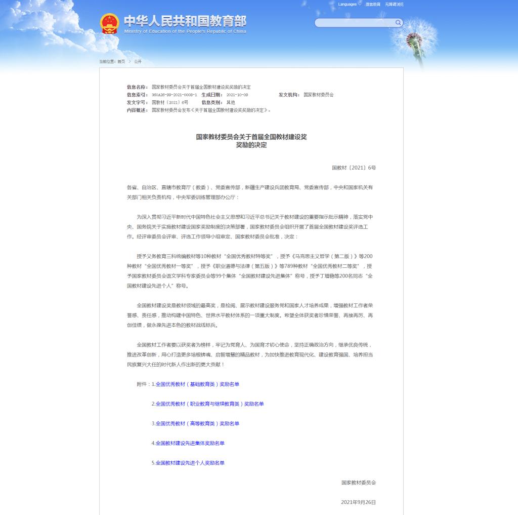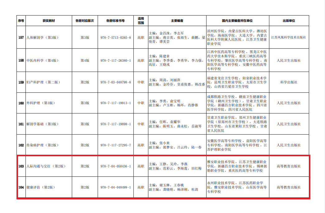 10月12日,教育部公布国家教材委员会关于首届全国教材建设奖奖励的决定。我校护理学院王静副教授主编的《人际沟通与交往》一书获得首届全国优秀教材二等奖。2020年开展的首届全国教材建设奖评选,是新中国成立以来首次设立全面覆盖教材建设各领域的专门奖励项目,也是全国教材建设领域的最高奖。