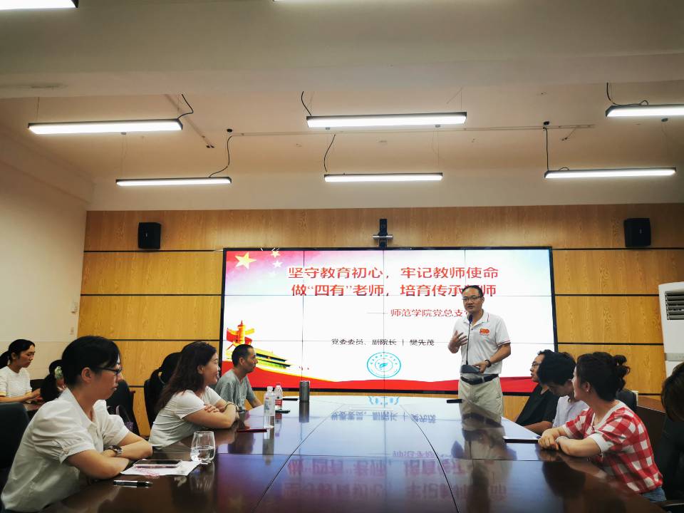讲授中,樊先茂还分享了生活中不少鲜活的事例,生动形象地向老师们讲述了何为真正有责任感、有理想信念的教师。他说,只有真正爱岗敬业的人才会把自己的事当作教育的事来做。并引用孔子语录“其身正,不令则行,其身不正,虽令不从”告诫大家要当好学生的引路人,用自己好的作风、思想和道德为学生树立一个好的榜样。“一个合格的老师,要爱自己的职业,爱自己的学生,上好每节课 ,做好教育教学本职工作。”樊先茂表示,衷心希望师范学院为学院的发展贡献更多智慧。