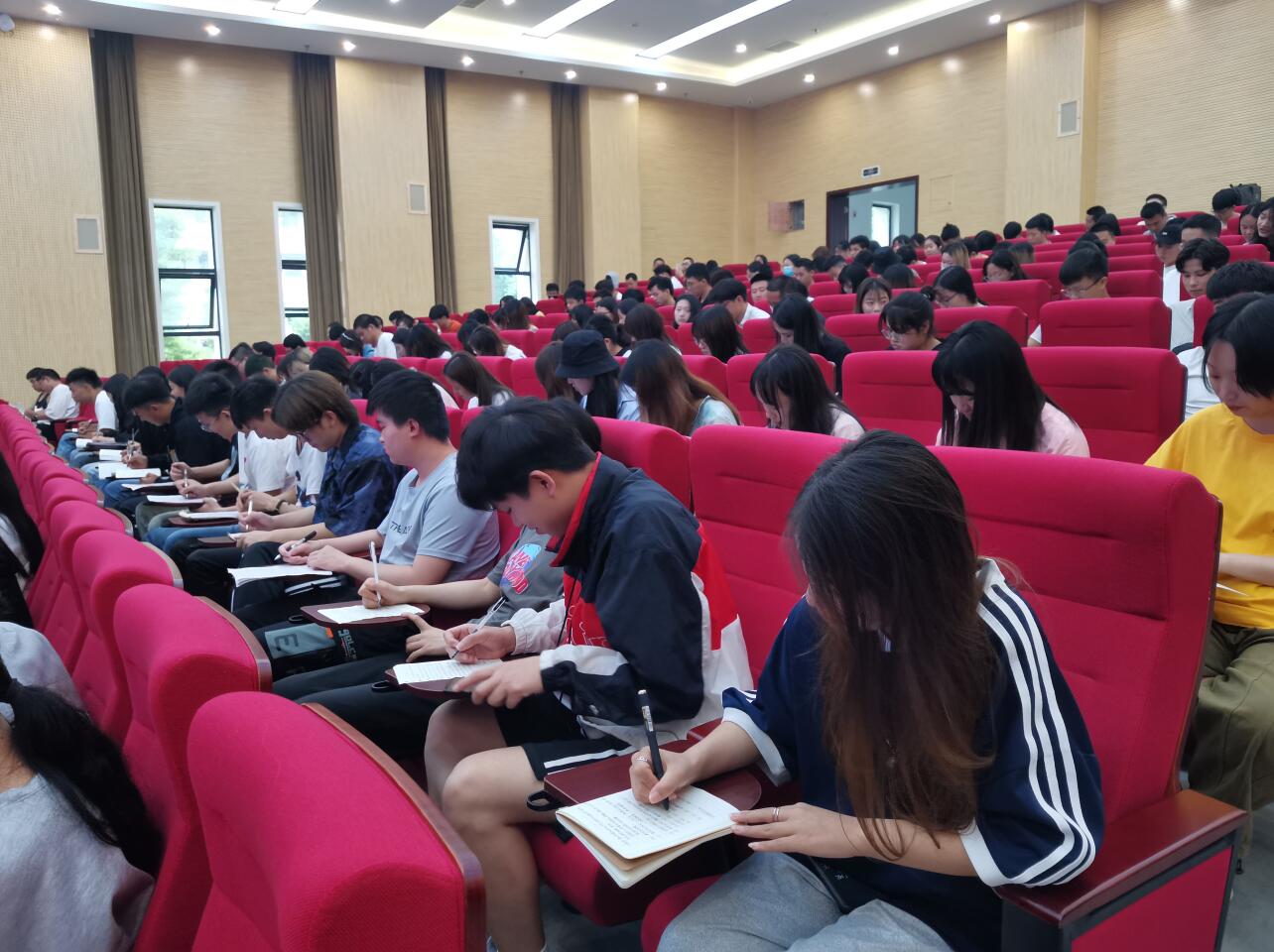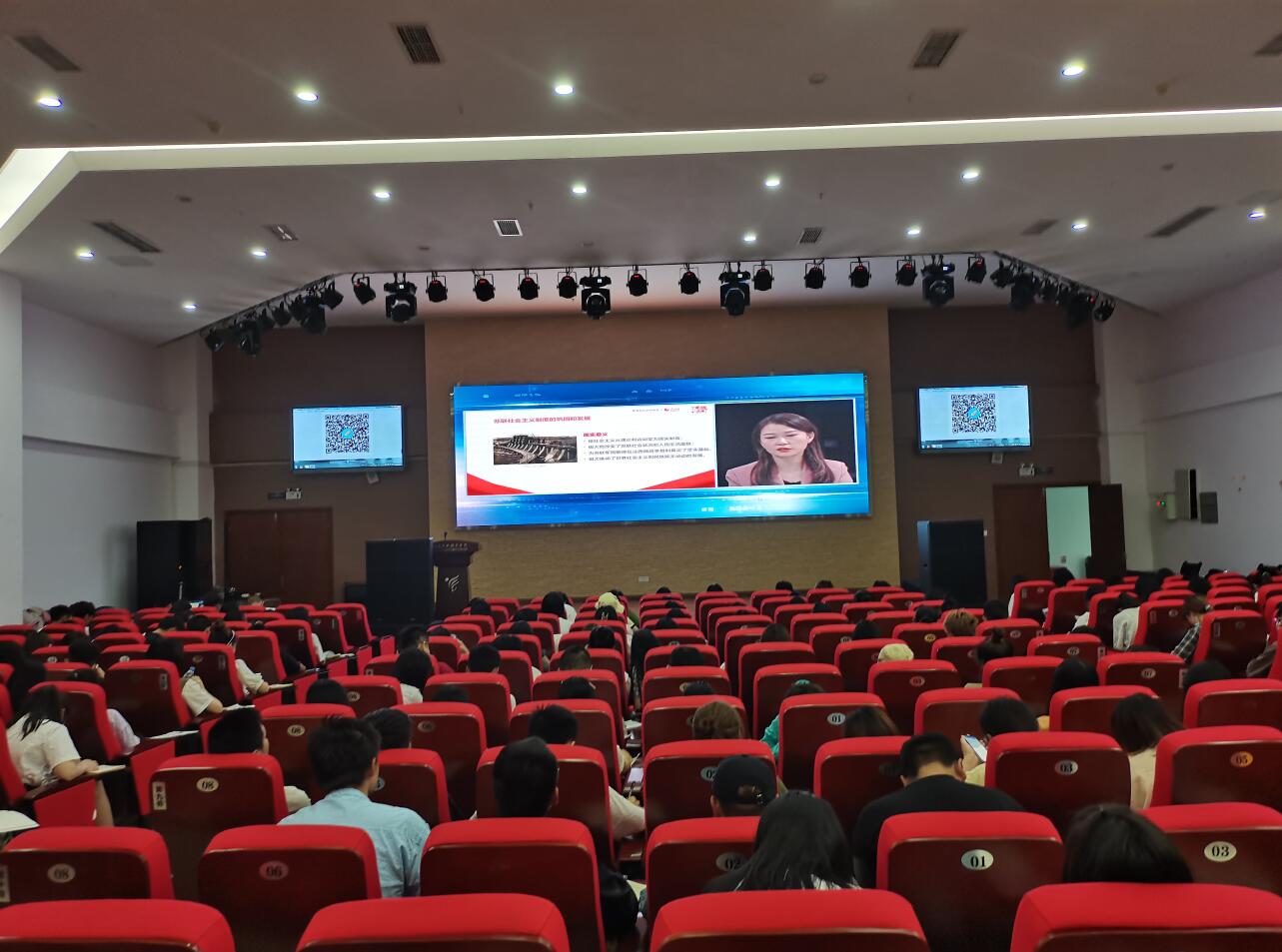 为了深入贯彻落实习近平总书记关于深化思想政治理论课改革创新和“大思政课”的重要指示批示精神,全面落实习近平总书记在党史学习教育动员大会上的重要讲话精神和中央安排部署。按照《教育部社科司关于组织全国大学生“同上‘四史’思政大课”的通知》,5月22日下午,思想政治理论课教学部会同组织人事处、院团委、学生处,在各二级学院党总支、直属党支部的大力配合下,组织师生观看“同上‘四史’思政大课”第四堂课:“同上社会主义发展史思政大课”。思政部通过集中和自学两种方式,组织500多名学生、入党积极分子在经开区校区聚雅厅、青年路校区圆弧大厅两个地点集中学习,思政课教师组织全院其他班级学生分别收看。