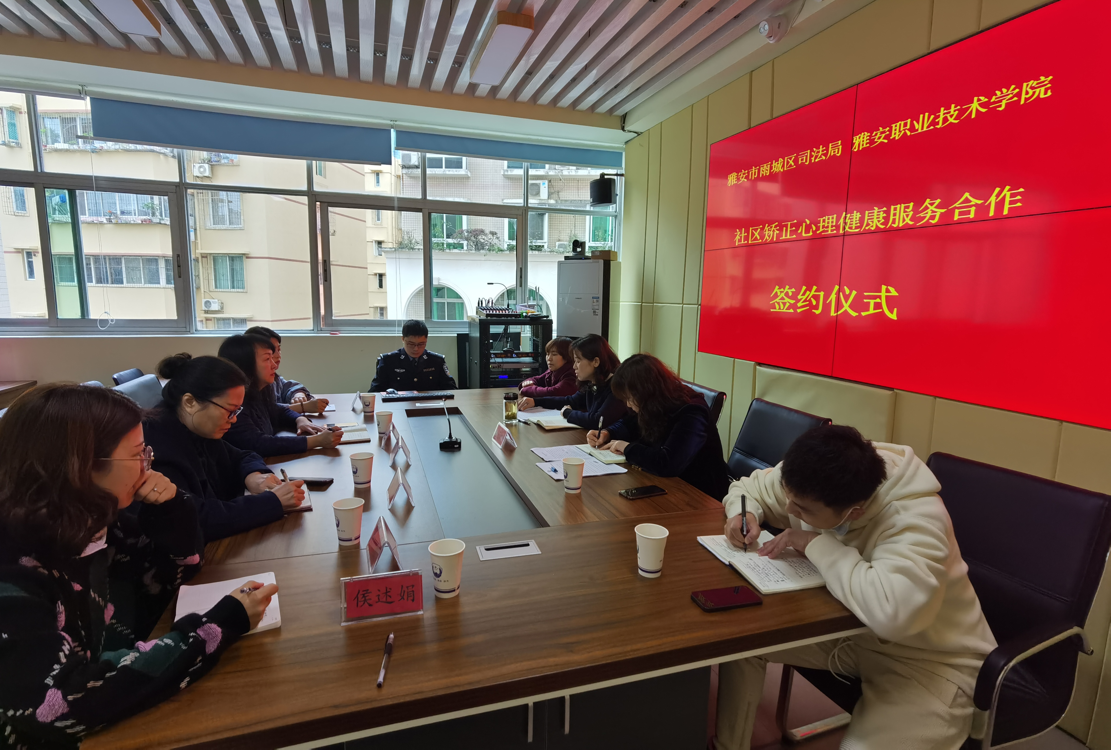 3月16日上午,学院与雅安市雨城区司法局的心理健康服务项目签约仪式在雨城区司法局司法行政指挥中心举行。学院党委副书记付洪涛,雨城区司法局党组书记、局长陈艳,学院思政部主任李霓,部分心理教师代表等参加签约仪式。签约仪式由雅安市雨城区司法局副局长陈萍主持。