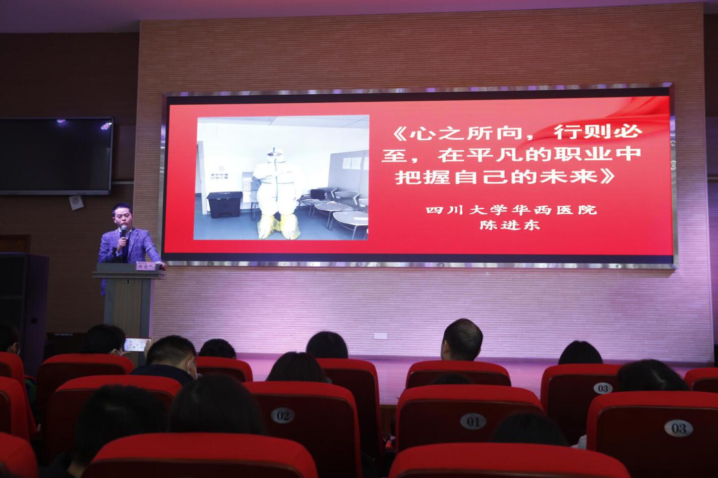 为弘扬抗疫精神,树立青春标杆,围绕“人人出彩、技能强国”职业教育活动周主题,11月10日下午,学院疫情防控先进事迹校友报告会分别在青年路校区汇雅厅和实训与服务中心聚雅厅举办。曾跟随援鄂医疗队前往武汉一线抗疫的彭云耀、陈进东、杨兴蓉、李涯霖四位校友及见义勇为者在校生解雪连受邀来校,就抗疫期间的感人故事和日常工作中的感悟和体会与师生进行了分享。学院党委副书记付洪涛,党委委员、宣传统战部部长郭英才,各二级学院党政负责人,教师、辅导员代表及学生代表共600余人参加了报告会。报告会由宣传统战部副部长尹雪智主持。