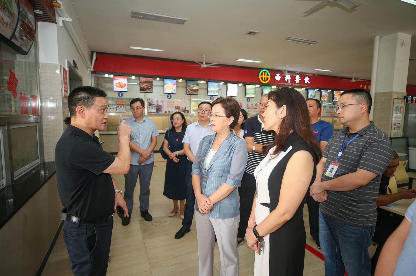 9月7日下午,市人民政府党组成员、副市长朱莉一行到实训与服务中心学生食堂检查工作。市市场监管局局长任永强、副局长卫刚,市教育局副局长许江涛,经开区管委会副主任徐方亮,学院党委书记李春模,党委副书记、院长石静,党委委员、副院长谭凌陪同检查。