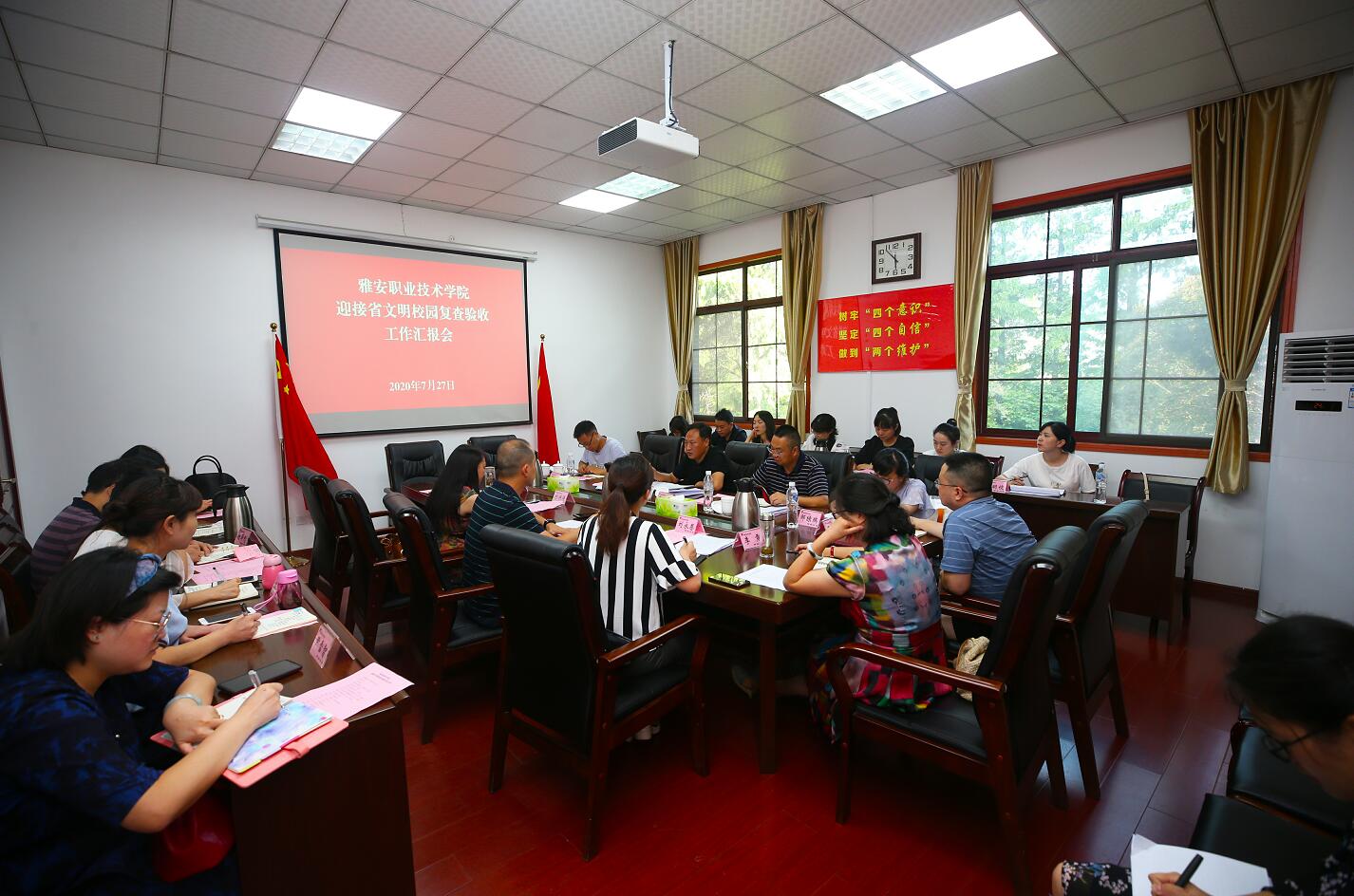 7月27日下午,省教育厅、省文明办委托雅安市委宣传部、文明办进校开展省文明校园复查验收工作。复查组由市委宣传部副部长、市文明办主任魏涛一行6人组成。学院党委副书记付洪涛汇报了我院文明校园建设情况,党委委员、宣传统战部部长郭英才主持汇报会。