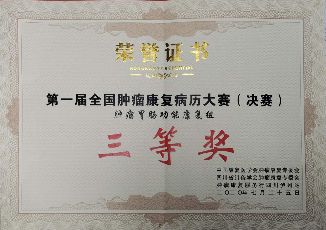 比赛过程中,附属医院中医骨伤?康复医学科团队成员沉着应对,配合默契,一路过关斩将,以优异的成绩顺利晋级决赛,并以夯实的专业基础、流畅的语言表达和优质临床案例在晋级决赛的30个康复团队中脱颖而出,荣获第一届全国肿瘤康复病例大赛(胃肠组)三等奖。