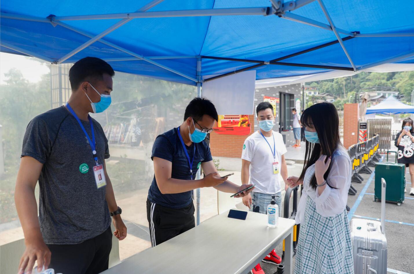 按照学院安排,返校学生戴着口罩,间隔1.5米沿着醒目的地面标识排队等候,依次进行行李消毒、体温检测、健康码查验、身份核验、报到注册,完成登记注册后由宿舍管理老师查验“学生报到通行证”和“学生公寓出入卡”后,进入宿舍入住。工作人员以暖心的笑容与严谨的态度帮助同学们一趟趟搬运行李,引导他们有序排队,同学们依次测体温,出示学生证、身份证、健康码,整个过程秩序井然、平稳安全。