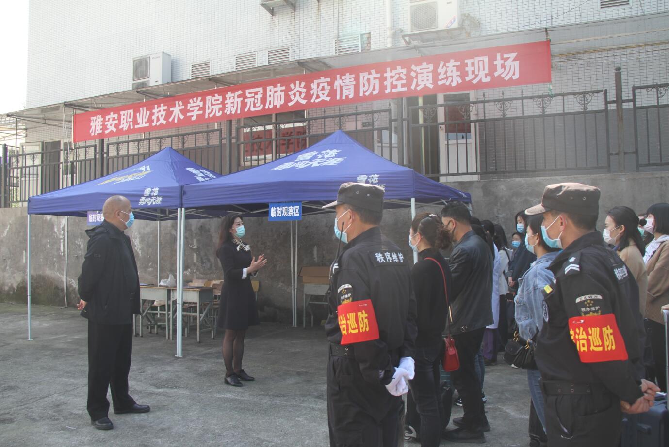 为有序做好开学疫情防控工作,保障师生的身体健康和生命安全,学院于4月23日下午、4月24日下午分别在青年路校区、实训与服务中心、临床医学中心开展学生返校疫情防控模拟演练。雅安市委宣传部副部长寇青同志莅临学院观摩指导,学院党委书记、新型冠状病毒感染肺炎防控工作领导小组组长李春模,学院党委副书记、院长、新型冠状病毒感染肺炎防控工作领导小组组长石静担任演练总指挥。党委副书记付洪涛、党委委员副院长樊先茂、副院长樊正康分别作为各校区演练现场指挥。学院党政班子成员、各部门及二级学院(部)负责人、全体辅导员(班主任)、教学及学管干事、学院新型冠状病毒感染肺炎防控工作领导小组其他人员等现场观摩演练。