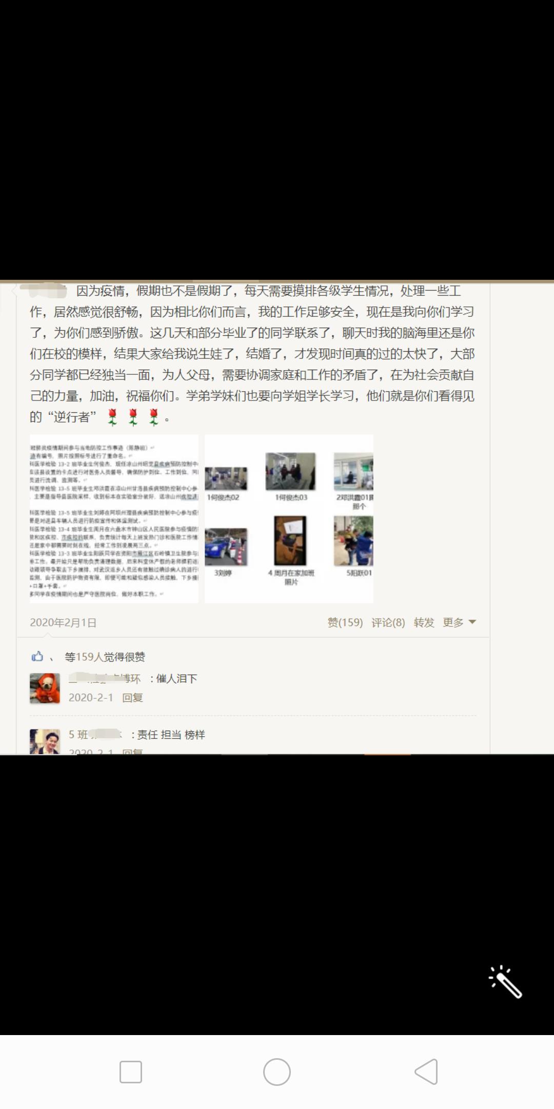 双“宁”在线------王宁从老家回来后居家隔离,仍然密切关注实习在岗学生、参与防控志愿活动学生的行动轨迹,在线上留言成了她日常的常态“安全回家报个平安?在哪里做了联防联控工作?”