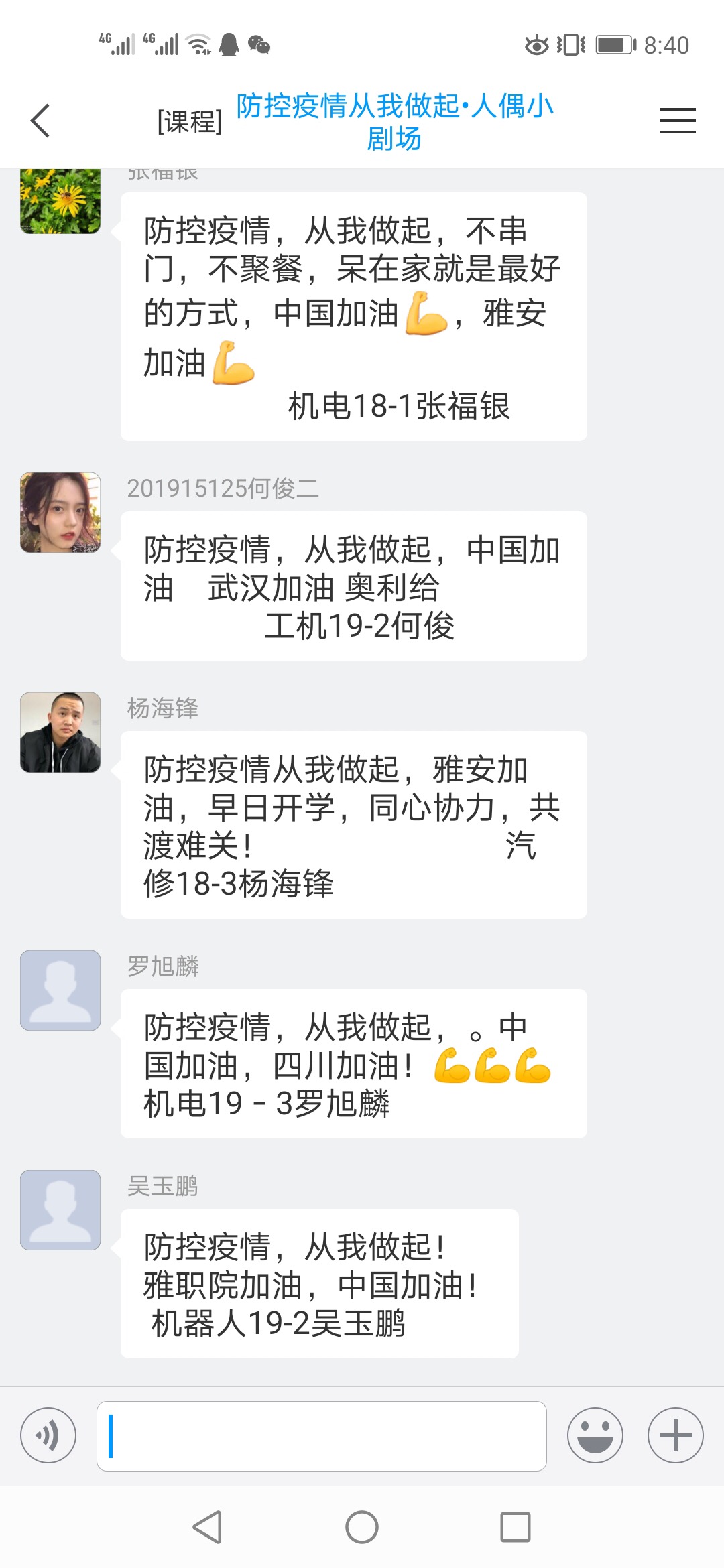 智信学院辅导员王罗建立了“防控疫情,从我做起”人偶小剧场;每个班都成立了防控小组,发挥班委作用,精心挑选3-4名班委担任小组长,定时排查上报信息以及传达相关疫情防控通知。人偶小剧场为学生宣传防疫教育知识,通过视频会议召开主题班会,同学们纷纷留言为中国加油,传递学生心声,让家国情怀扎根在学生心里。