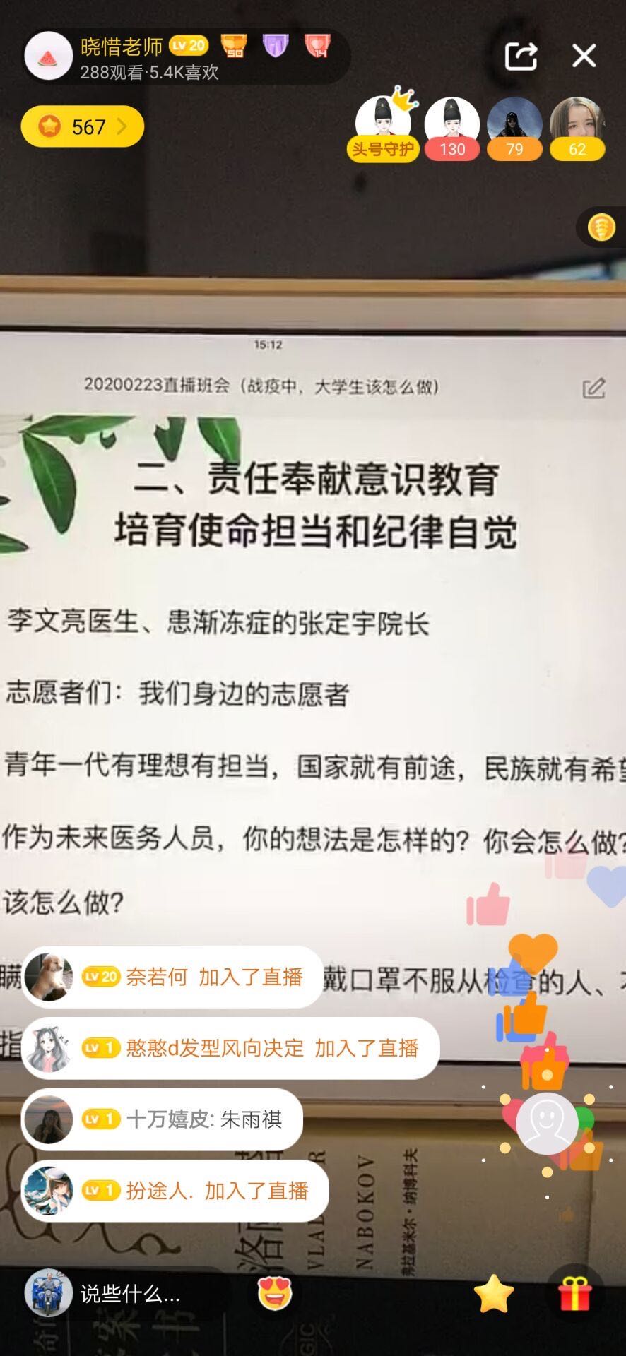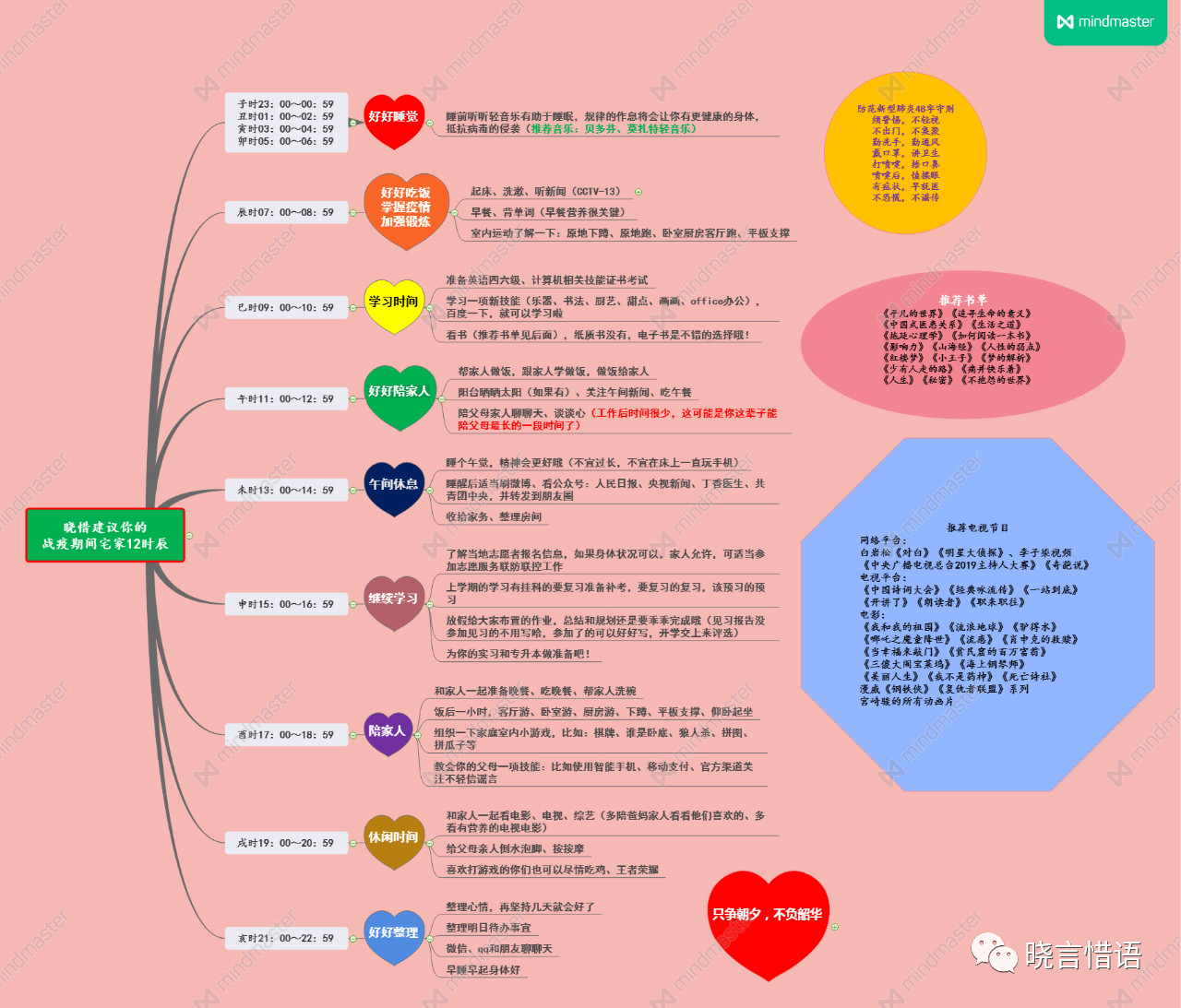 张晓惜用心绘制出“战役时期宅家12时辰”图例,从早晨7点到晚上11点都安排的有条不紊,建议学生们从吃饭、学习、运动、休息等方面细致地列出具体可行的措施,密密麻麻而简单有序的文字将图谱装的满满的,可以说这张图成了无聊的克星,充满了对学生的关心,对工作的热爱。她用学生喜闻乐见的方式成为学生喜欢的主播,挤时间就在QQ空间直播,快看@“战疫中,大学生该怎么做”的主题班会开播了。