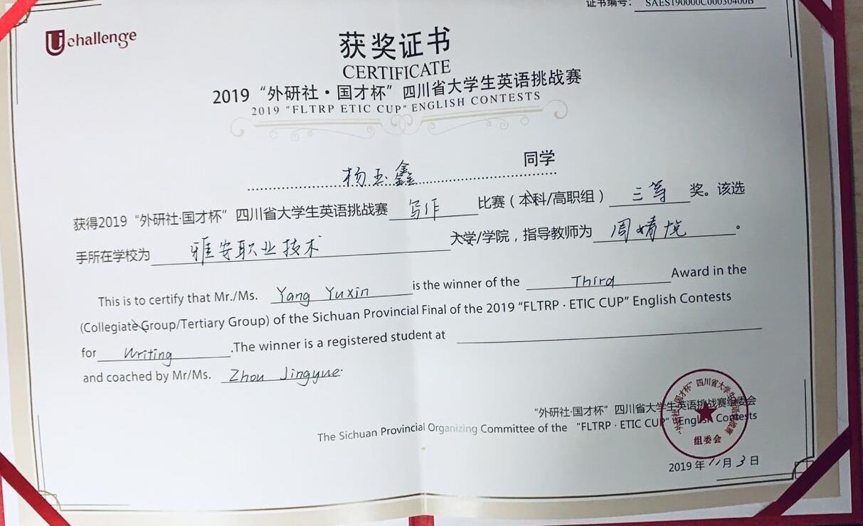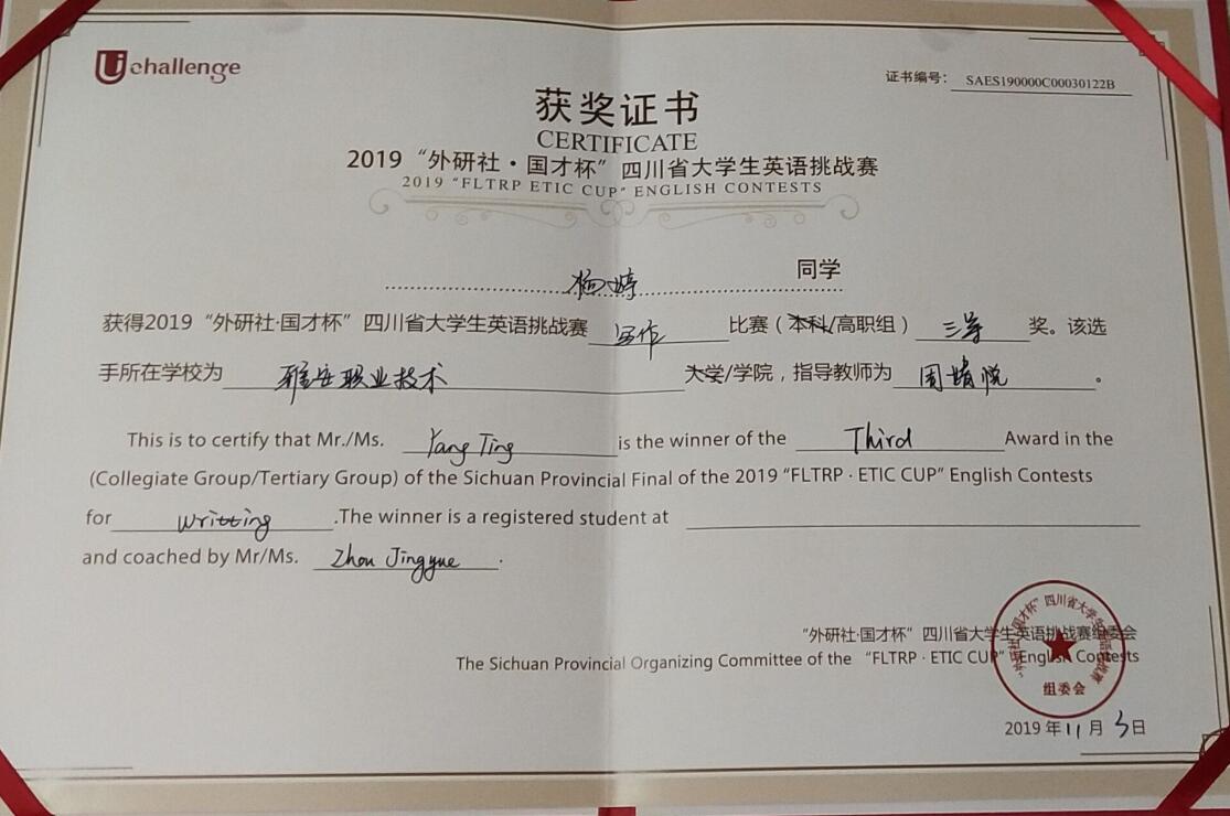 2019年四川省大学生英语挑战赛分为大学生英语演讲大赛、英语阅读大赛和英语写作大赛三项赛事。师范学院外语教研室高度重视此项大赛,指导教师梁小华、付志娟和周婧悦从300名初赛选手中遴选了五名同学,经过前期一个多月的悉心培训和指导,五位同学不负众望,从全省高校300多名参赛选手中脱颖而出,分别荣获2019年四川省大学生英语挑战赛演讲省级二等奖、阅读省级三等奖和写作省级三等奖等奖项。