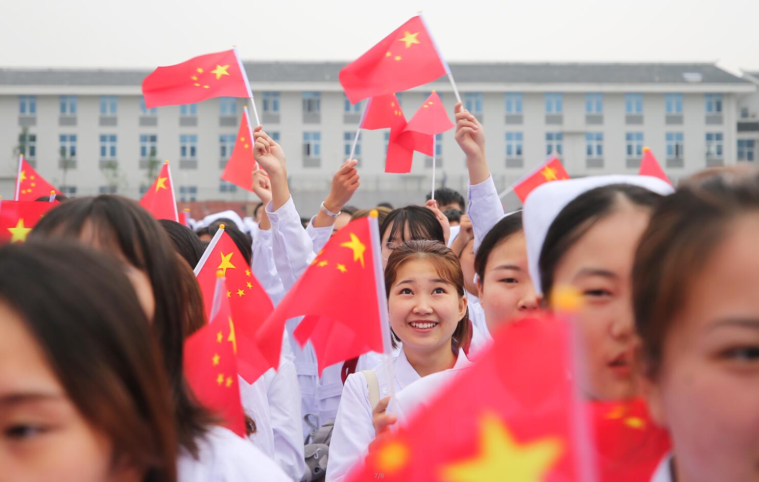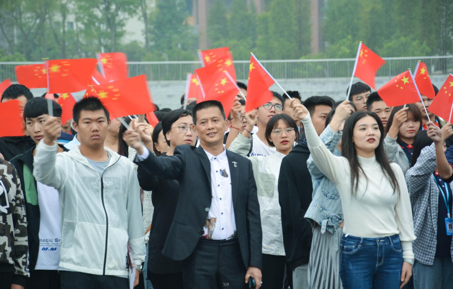 在全体师生的注目下,升旗手身着绿色军装,迈着整齐的步伐、昂首挺胸地护送着五星红旗缓缓进场。随着庄严的国歌响起,升旗手振臂一挥,鲜艳的五星红旗迎风展开,随着音乐冉冉升起。在场的师生们行着庄严的注目礼,面容肃穆,内心翻涌,专注的眼神里满含着对祖国无限的热爱与崇高的敬意。伴着金秋明媚的阳光,迎着十月的云淡气爽,有多少感动和荣光,梦想和辉煌,都凝聚在每一个中国人的心里,也烙印在新中国的里程碑上。