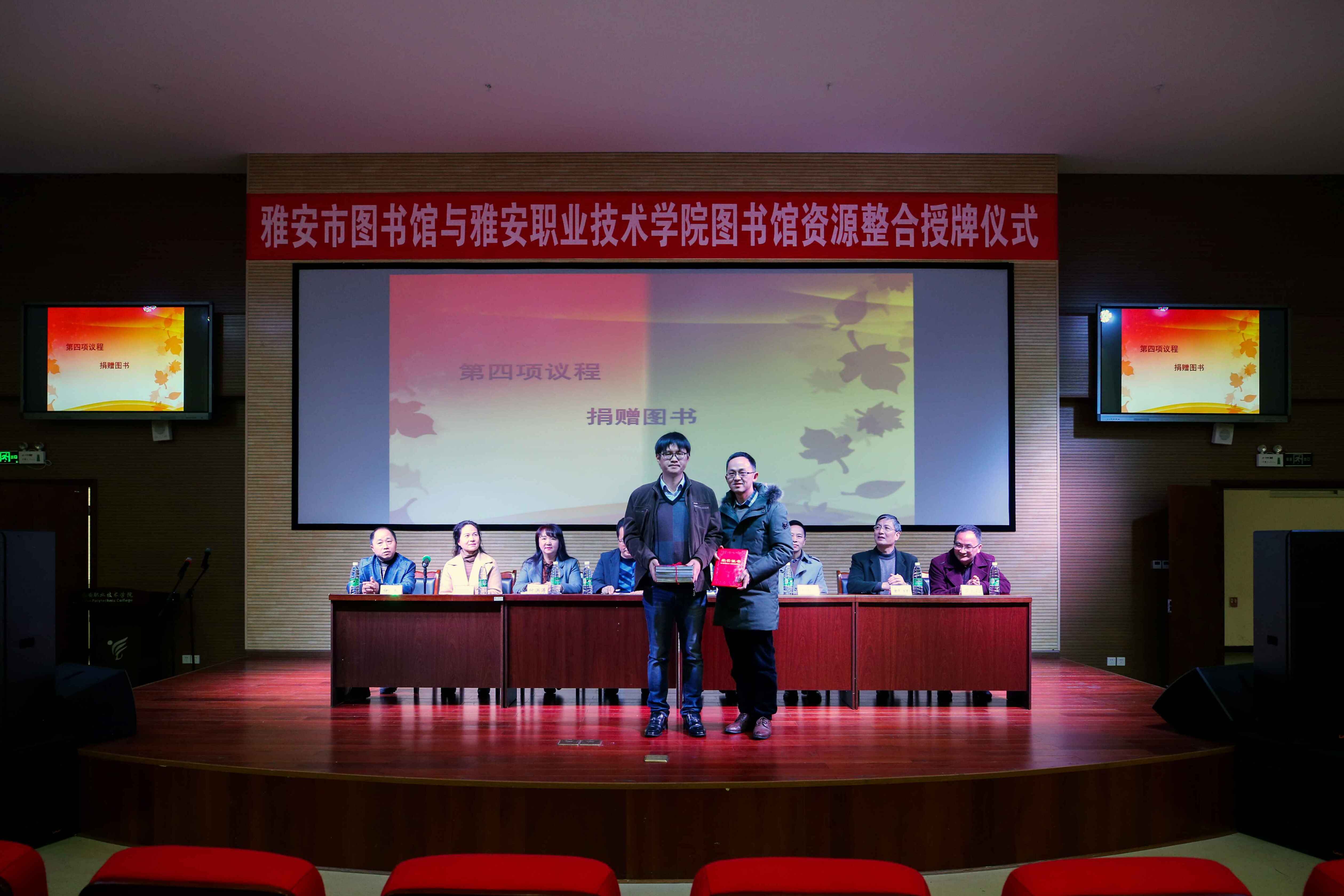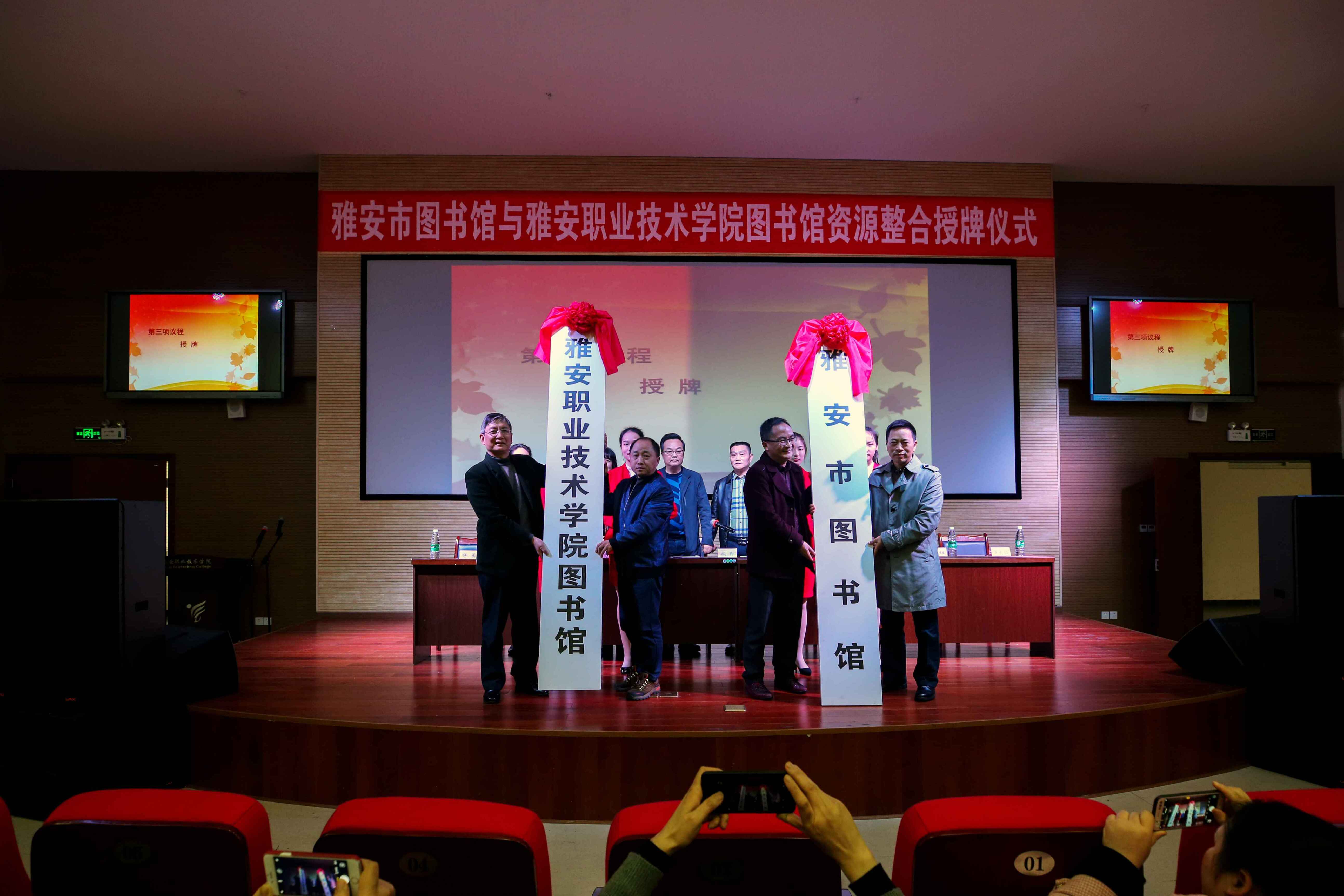 授牌仪式上,杨建光为学院图书馆授“雅安市图书馆”牌子,刘红受党政委托为雅安市图书馆授“Beat365唯一官方网站图书馆”牌子。雅安著名少儿科幻作家陆杨为学院图书馆捐赠了图书。寇青宣布由雅安市图书馆、雅职院图书馆共同开展的“雅安市‘书香雅安、阅读快乐’全民阅读推广活动”正式启动。