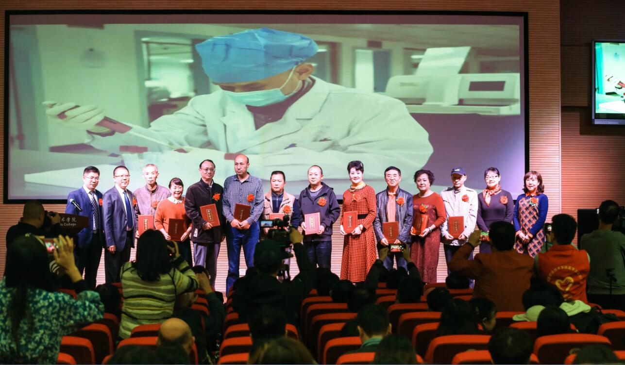 在场人员观看了院庆宣传片《六十年筚路蓝缕 不忘初心谱新篇》、诗朗诵《风雨同舟60年》和手语《感恩的心》,医院离退休老同志向医院赠送字画。接着学院领导向医院建院老同志代表献花、职工代表向历届医院领导代表献花、医院领导向“30年风雨同舟奖”获得者代表颁发荣誉证书。“30年风雨同舟奖”获得者代表张明英和青年职工代表王旭分别讲话,表达了对医院获得现在成就的自豪和对未来发展的期望。薛正毅带领医院职工代表和医学生代表重温医学生誓词。