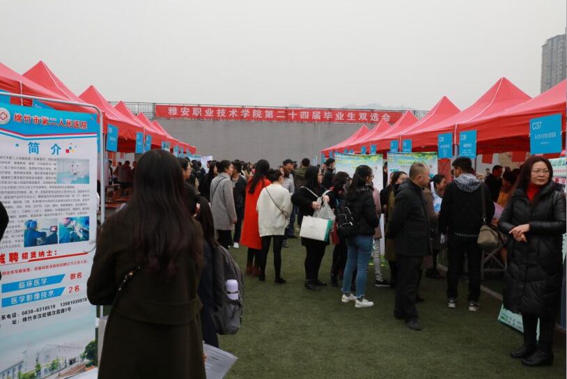 【本网讯】12月1日,学院第二十四届双选会在青年路校区体育场隆重举行。本次双选会历经两个月的筹备,共邀请参展单位400余家,提供就业岗位9000余个。其中,医药卫生单位169家,提供就业岗位3100余个,医药卫生相关企业68家,提供岗位2000余个,教育、机电、旅游相关企业173家,提供岗位4000余个。经统计,在本次双选会中,共提供临床医学相关岗位850余个,医学影像技术相关岗位190个,护理相关岗位700余个,药学相关岗位350余个,医学检验技术相关岗位150个。