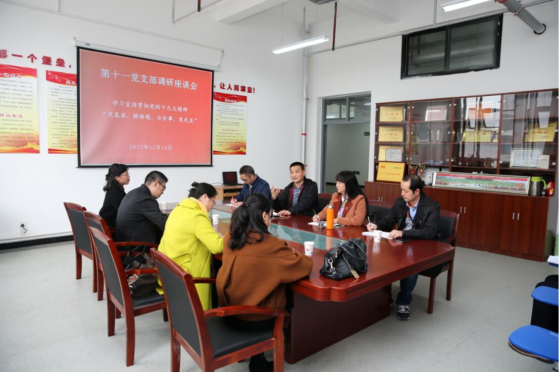 【本网讯】为贯彻落实省委、市委及学院党委“开展新一轮‘走基层、解难题、办实事、惠民生’活动”要求,深入学习宣传贯彻党的十九大精神,进一步加强学院党建工作,提高党建科学化水平,11月14日下午,党委书记李春模到学院第十一党支部进行调研。党委副书记付洪涛、党委办公室主任江成鹏、宣传统战部部长郭英才陪同调研。第十一党支部书记、副书记、支部委员,旅游经济管理系和思想政治理论课教学部负责同志以及教研室主任、团总支书记、民主党派代表、教师代表等30余人参加座谈会。